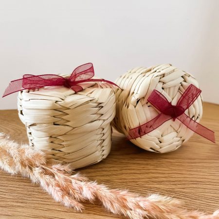 Embrace rustic charm with this handmade gift box crafted from natural woven palm leaves. Featuring a minimalist design and a lovely bow detail, this eco-friendly box is perfect for presenting small gifts or adding a touch of natural elegance to your decor. Its sturdy construction makes it both practical and beautiful.